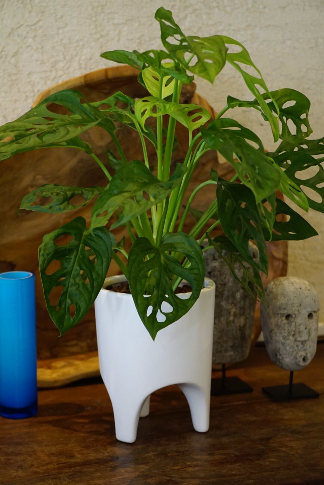 個性的な穴の空いた葉っぱがポイントのマドカズラ。つる性なので成長すると葉が垂れ下がってきます。